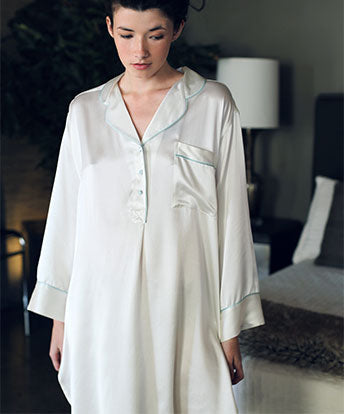 Most loungewear is made with 100% grade A mulberry silk charmeuse. Charmeuse silk is soft, supple and has a fabulous sheen. It is woven in a satin weave, where the warp threads cross over three or more of the backing threads. The front side of the fabric has a satin finish, lustrous and reflective, and the back has a dull finish.